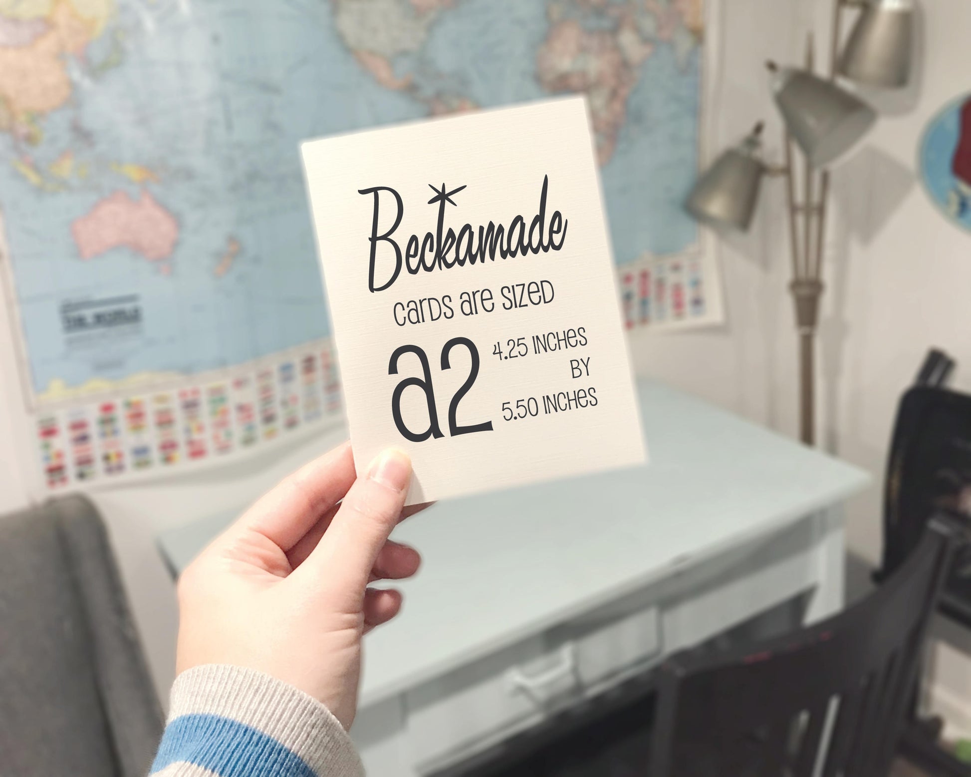 Card measures 4.25 inches by 5.5 inches. You will get 1 card with a coordinating colored envelope.