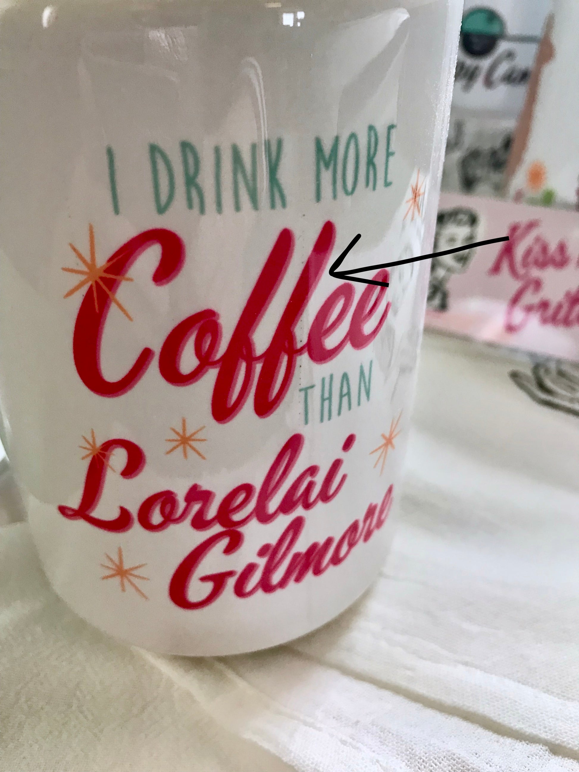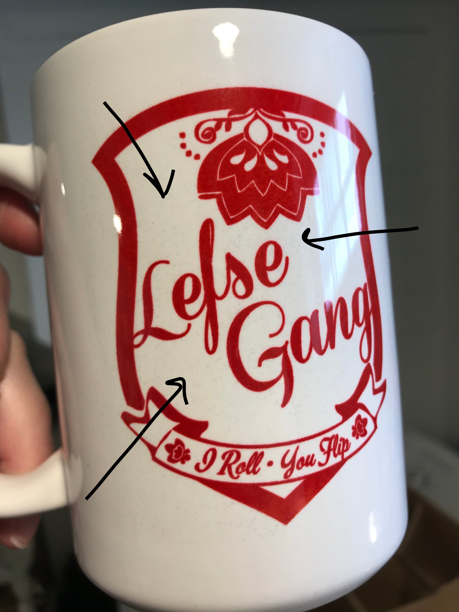 Mugs have either a mark or spotting in the design or an imperfection in the ceramic glaze.